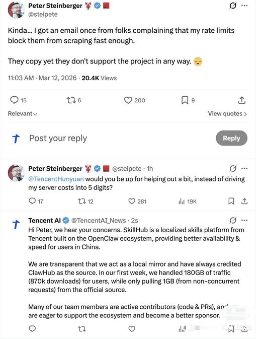此前,斯坦伯格曾在社交平台X上批评腾讯,指出其名为SkillHub的服务复制了OpenClaw社区的skill文件并分发给自身用户,却未对开源社区做出实质贡献,违背了开源精神。他在帖子中明确表示,如果腾讯想支持OpenClaw,社区对捐赠和协助维护持开放态度。