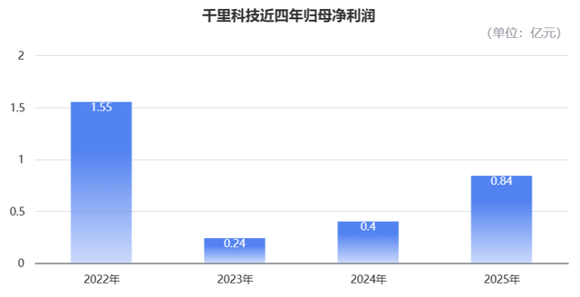 盈利方面,千里科技在2025年的归母净利润达到0.84亿元,同比增长了110.93%,相较前一年的0.4亿元翻倍增长。