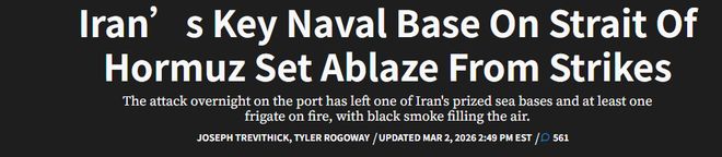 据报道,特朗普于3月1日宣称已摧毁并击沉了多艘伊朗海军舰艇。卫星图像显示,伊朗海军基地遭受严重破坏。外界普遍认为这是美军为了遏制伊朗封锁霍尔木兹海峡的能力而采取的军事行动。