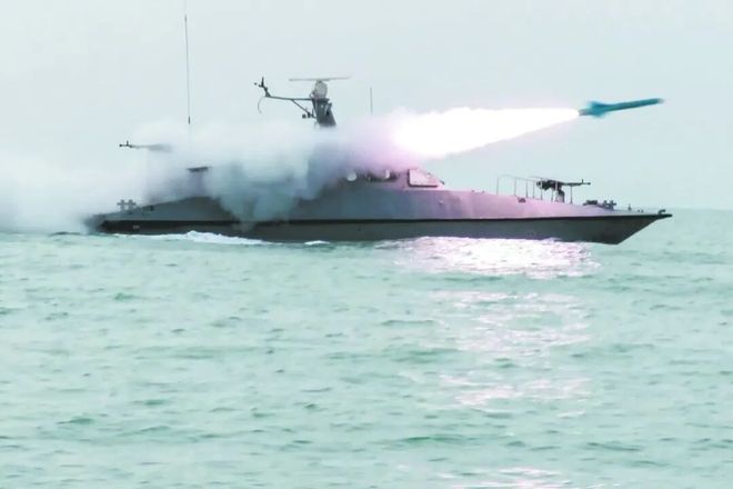 2月16日,伊朗军方发布了一系列照片展示海军与伊斯兰革命卫队在波斯湾联合演习的场景,其中一艘快艇正在发射导弹。