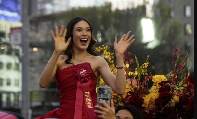 然而,今年这场巡游的最大亮点并不是那些璀璨夺目的花车,而是站在队伍最前列的一位奥运冠军——谷爱凌。