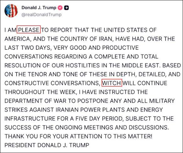 与此同时,美媒《每日野兽》网站还注意到一个细节:在特朗普用全大写字母写的声明中,出现了两处拼写错误。这则声明已经被删了重发。报道认为:“79岁的特朗普惊慌失措,在充满错别字的崩溃讲话中透露了其重大战争政策的180度大转弯。”
