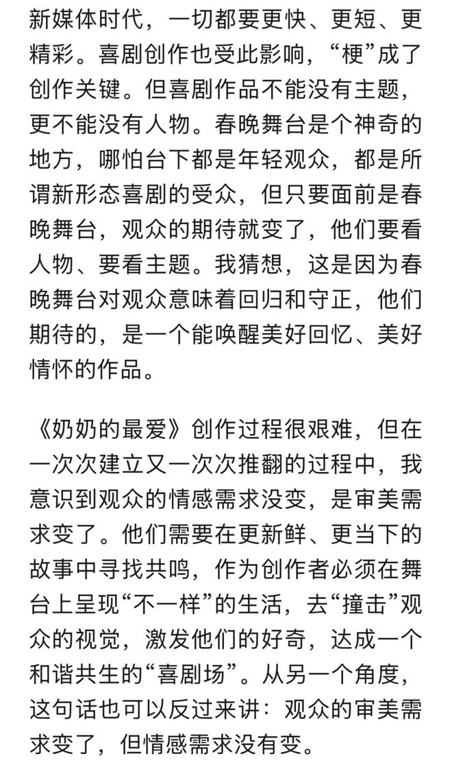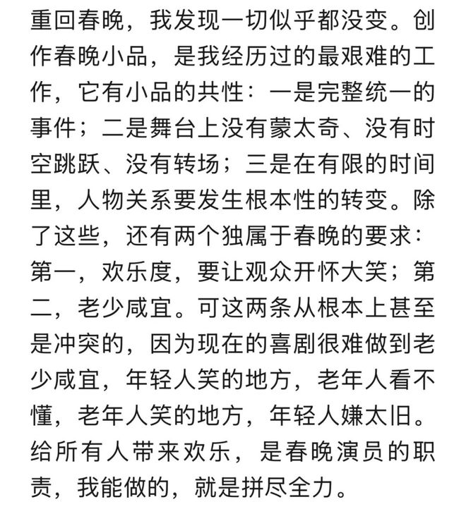 首页/国内新闻/蔡明:创作春晚小品,是我经历过的最艰难的工作,有两个独属于春晚的要求,从根本上甚至是冲突的蔡明:创作春晚小品,是我经历过的最艰难的工作,有两个独属于春晚的要求,从根本上甚至是冲突的作者:责任编辑:李超_NB128142026年2月18日国内新闻19 阅读 今日发表的《人民日报》,蔡明撰文《笑声里有好作品的答案》。以下为全文——蔡明撰文《笑声里有好作品的答案》审核 罗祎 王晨郁校对 杨佳音 海报分享“”免责声明:由于无法甄别是否为投稿用户创作以及文章的准确性,本站尊重并保护知识产权,根据《信息网络传播权保护条例》,如我们转载的作品侵犯了您的权利,请您通知我们,请将本侵权页面网址发送邮件到[email protected],深感抱歉,我们会做删除处理。←除夕蔡磊一家三口出镜送祝福,蔡磊身戴红围巾露出微笑,儿子将手放在他手上轻轻抚摸成都新年首班入境航班抵达:阿根廷小伙专程来蓉过中国年,摩洛哥小哥为成都“代言”→