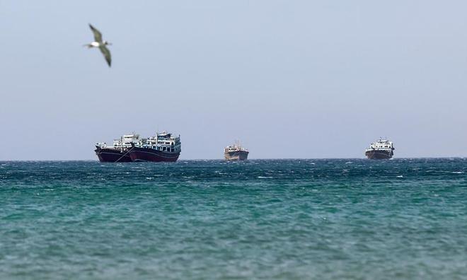 美以两国的军事行动导致了霍尔木兹海峡局势动荡不安。从阿曼穆桑代姆省望去,船只在狭窄的海峡中艰难通行。
