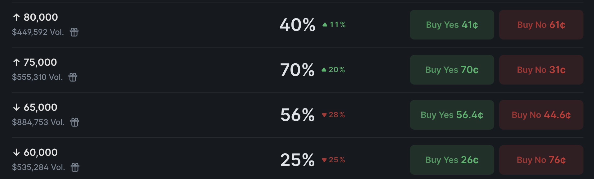 另一方面,三月份比特币价格跌至6.5万和6万美元的可能性较之前有所下降,这表明市场对下行风险的态度更加谨慎。