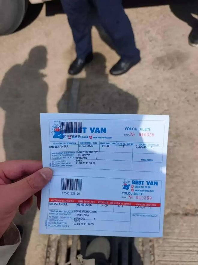 “前往土耳其的车非常多,而且检查也很严格。”到达埃尔比勒后,黄勇鑫花费50美金购买了从埃尔比勒到土耳其伊斯坦布尔的大巴,30多个小时的大巴车程,在和记者联系时,他表示自己目前仍在大巴车上,后方由同事协助已经购买的伊斯坦布尔经吉隆坡转机回广州的机票,花费3700元。