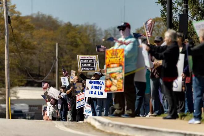 当地时间3月28日,民众在佐治亚州举行反对特朗普抗议集会,抗议者举着写有“美国优先是谎言”“食品价格上涨、天然气价格上涨”等字样的标语牌