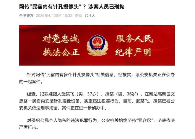 合肥市公安局通报指出,网传有关“民宿内安装多个针孔摄像头”的信息已经证实属实,并且该情况正由公安机关进行调查处理中。