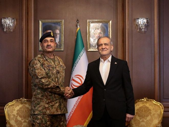 16日当天,伊朗总统佩泽希齐扬与巴基斯坦陆军参谋长穆尼尔会面,期间伊朗外长阿拉格齐也参与了会谈。在会上,佩泽希齐扬指出,巴基斯坦为实现战争停火做出了积极和负责任的贡献。