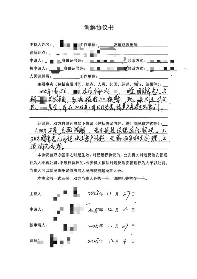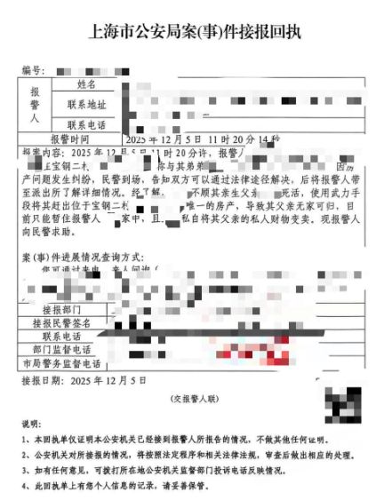 报案回执显示,2025年12月5日,女儿因房产问题报警,警方到场告知双方可以通过法律途径解决,并将报警人带到派出所进一步了解情况。