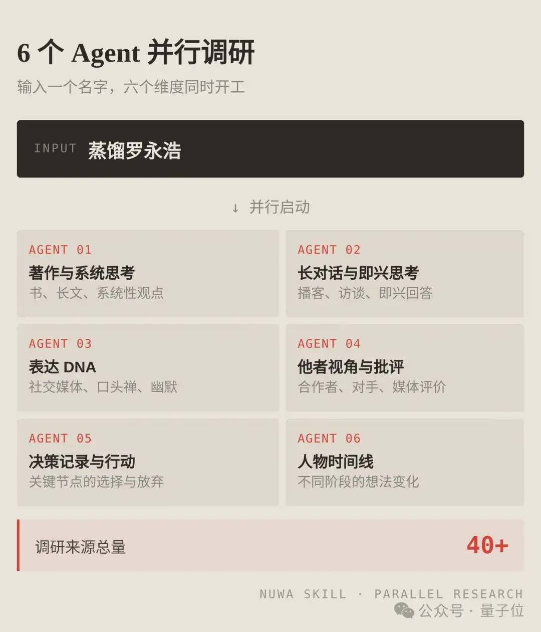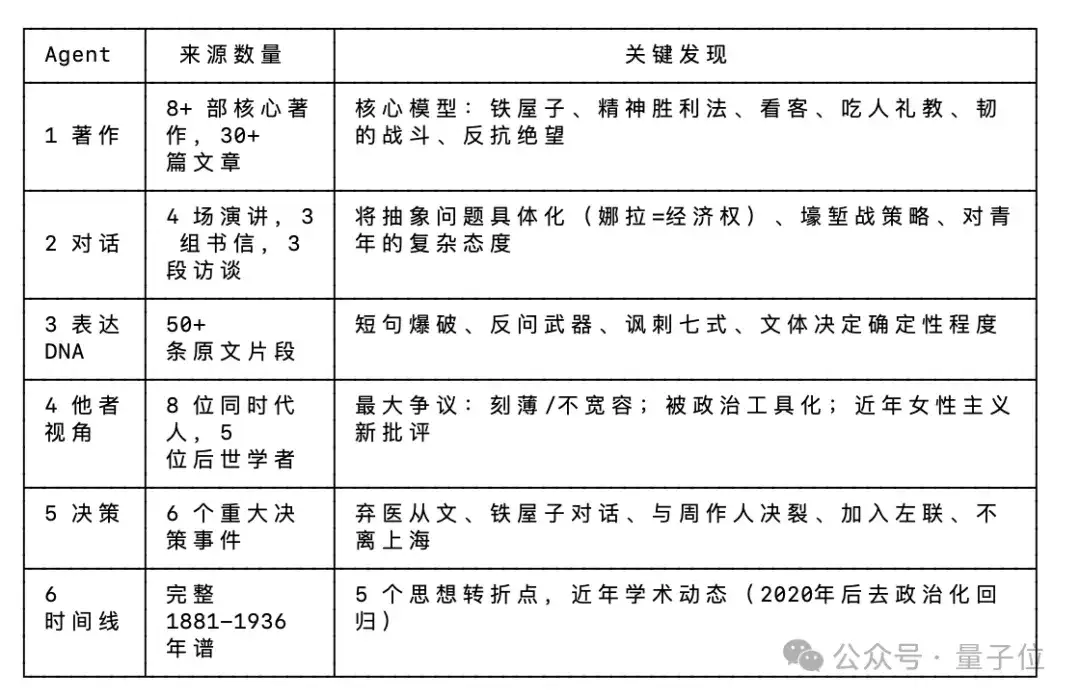 输入名字之后,AI立马拉了6个Agent开干,把鲁迅的8部核心著作、30+文章、4场演讲、3组书信和3段访谈,13个人的评价,统统都输入了。