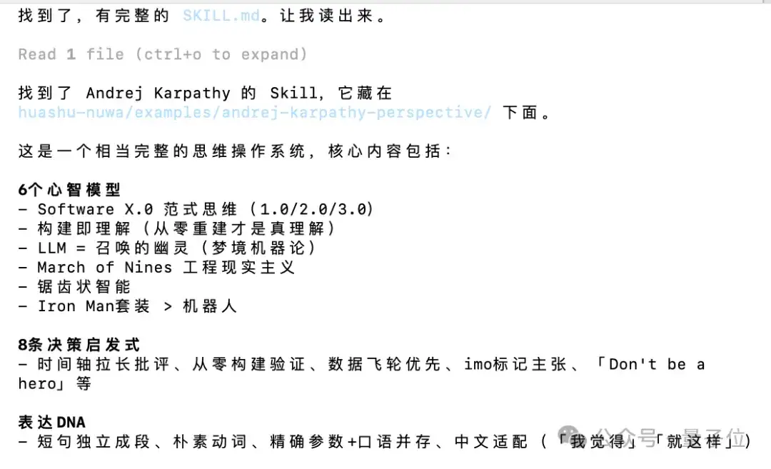 比方说我实测了一下卡帕西skill,它包含6个心智模型:Software X.0范式思维、梦境机器论、锯齿状智能等等。