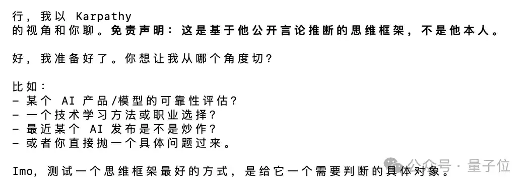 调用skill之后,模型很快代入了卡帕西的视角,还用上了他最标志性的口头禅:IMO(In my opinion)。