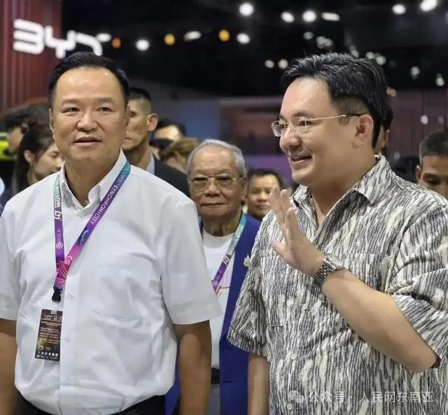 在曼谷国际车展上,泰国总理阿努廷·参威拉军(左)特意来到中国企业的展位进行参观。此前有媒体报道称,阿努廷已将其传统的劳斯莱斯座驾换成了中国的比亚迪电动车,并用作日常出行工具。在之前的公开活动中,他还曾乘坐过极氪品牌车辆。