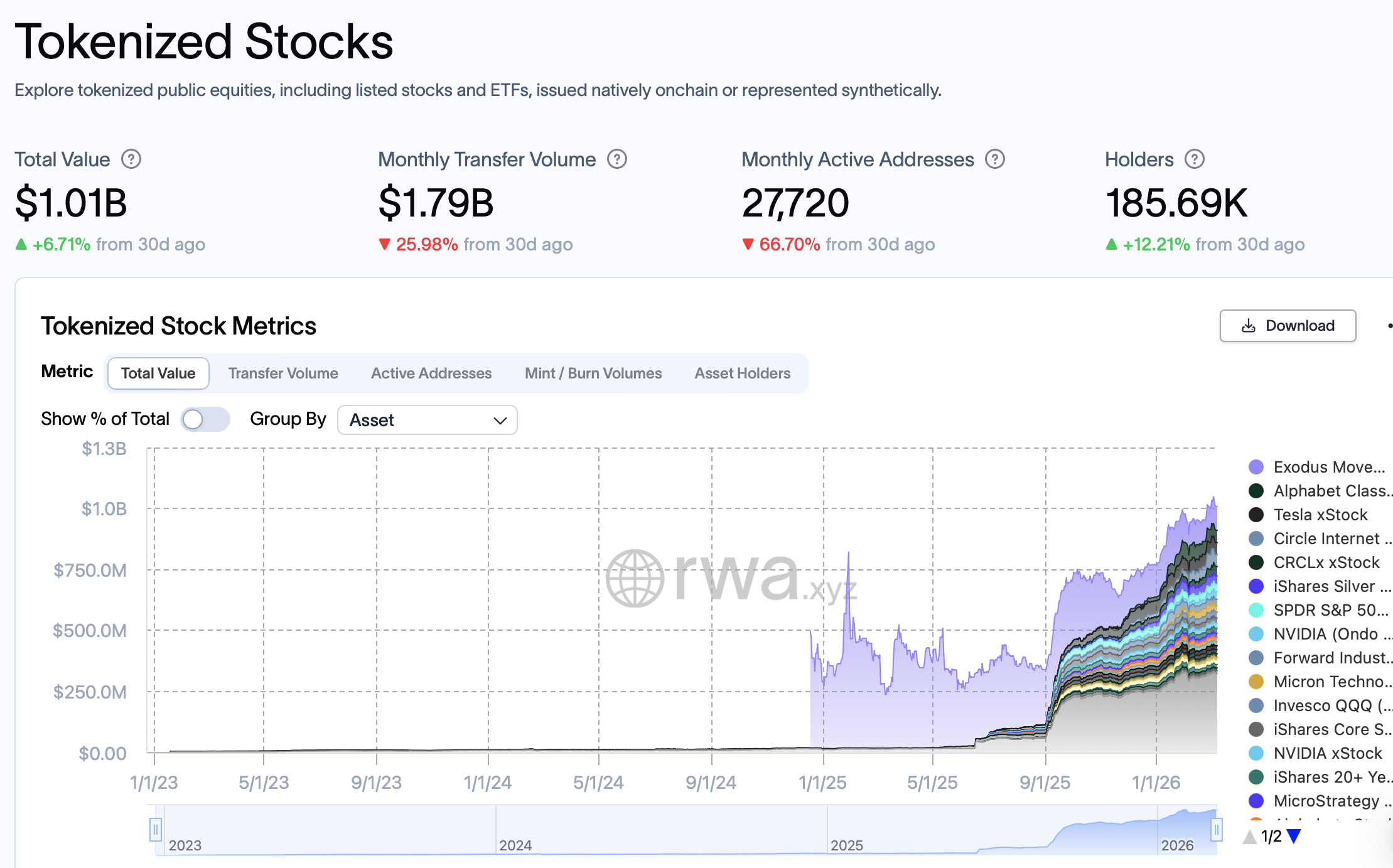 根据RWA.xyz的数据统计显示,目前在区块链上流通的公开股票总价值大约为10.1亿美元。