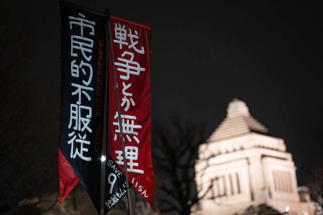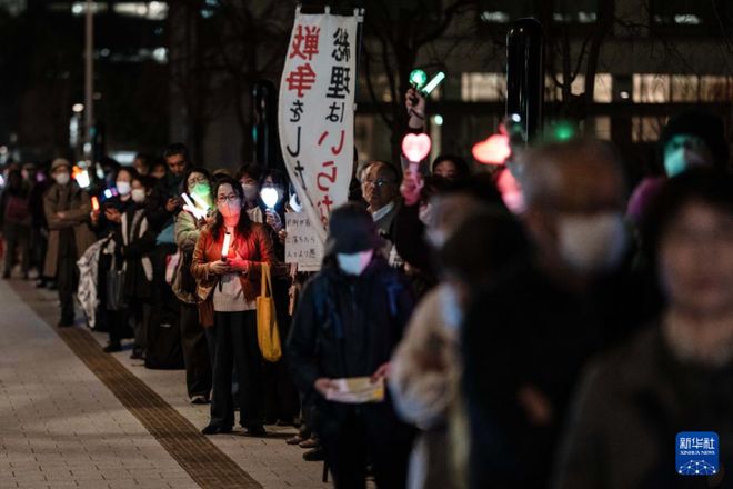2月24日,在日本东京的众议院第二议员会馆前,民众参加抗议活动 图:新华社