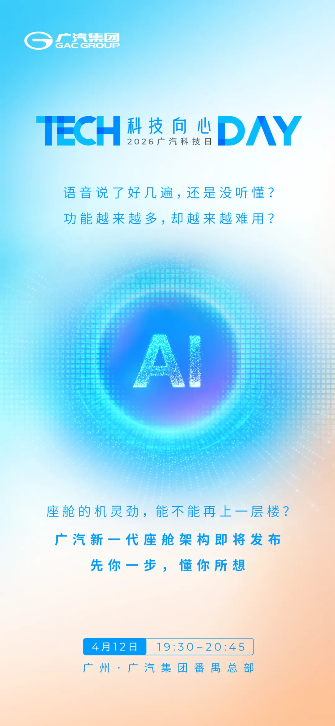 据报道,广汽集团将于4月12日在其番禺总部举行2026广汽科技日活动。本次活动的主题是“科技向心”,届时将展示新一代端云一体智能座舱架构、电子电气架构以及芯片生态建设的新进展。