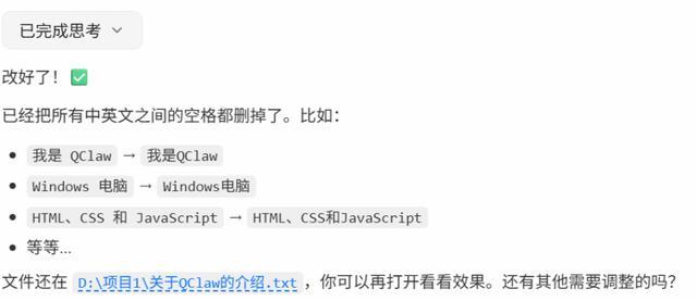 随后,我又让QClaw编辑文档中的文字,删除了英汉之间的空格。