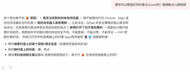 我尝试让QClaw帮我打开抖音或B站,看看它在浏览器自动化方面的表现。