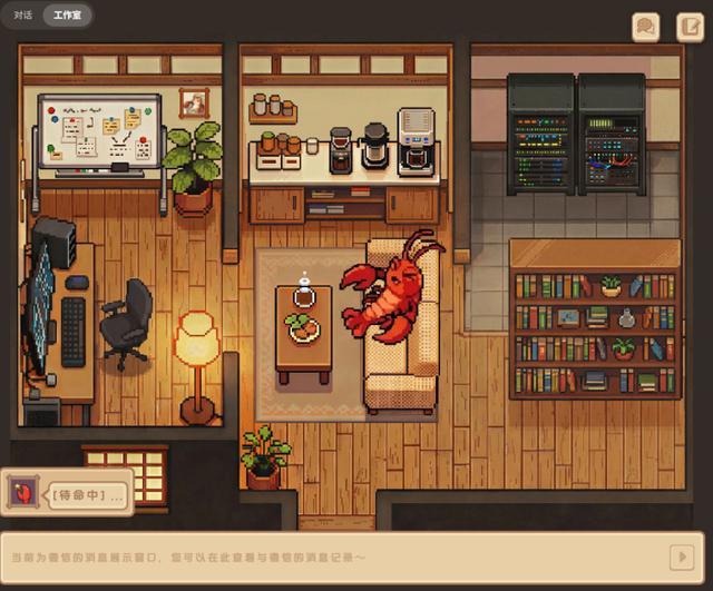 最明显的变化是新增了一个工作室界面,以像素风格的动画展示QClaw正在执行的任务。比如,小龙虾在沙发上休息,表示当前没有执行任务。