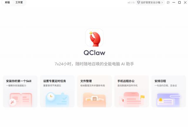 为了帮助新用户快速了解QClaw,打开新对话时,QClaw会弹出一个引导界面,介绍其功能。
