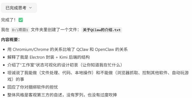 我要求QClaw生成一篇介绍文档,大约3分钟后,QClaw完成了任务。