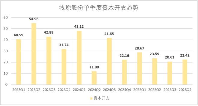 资本开支层面,正如前文所言,业绩会中管理层主动下调了2026年资本开支的预期,其实从2025年开年以来,牧原就已经调整了资本开支节奏,全年累计资本开支95.3亿,较2024年下滑了28.5%。