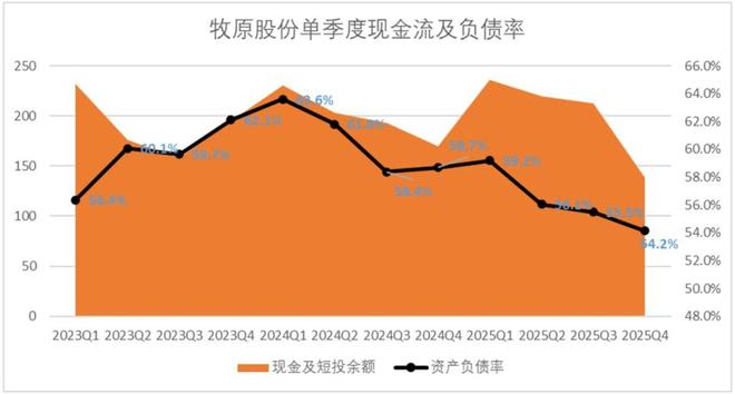 现金流层面,截止2025年末,牧原股份现金及短投余额139亿元,环比同比均出现了下滑,主要原因还是维持了一年的降负债动作。