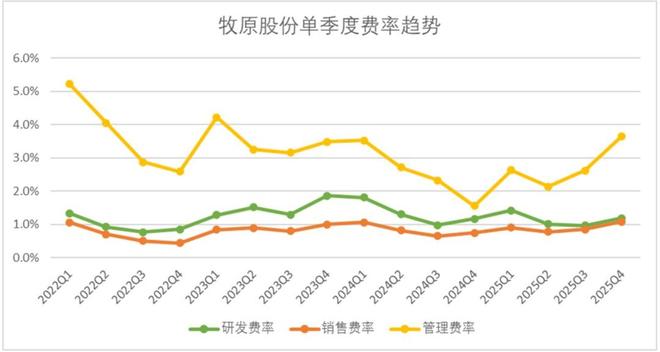 费用层面,2025年第四季度牧原股份的销售费用、管理费用、研发费用分别录得3.5亿元、11.8亿元、3.9亿元,从费率趋势来看,销售费用维持在1.1%、研发费用为1.2%,环比微增了20bp。