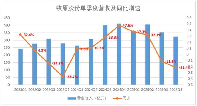 拆分季度来看,2025年第四季度,牧原录得营业收入324亿元,同比大幅度下滑21.4%。2025年下半年连续两个季度营收负增长,产能扩张的红利没能抵御周期下行的压力。