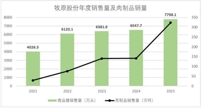 与营收形成鲜明对比的是,2025年全年牧原股份的出栏量突破新高,达到了接近7800万头。过去一年间,牧原扩产节奏相当激进,并且2026年给出了7500万头-8100万头的指引。要知道去年全国范围内的出栏量只有7.2亿头,相当于牧原的市占率达到了11%,未来还有扩大的趋势。