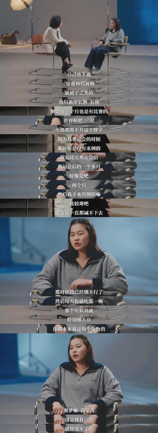 她表示 第一次来例假,吃一点体重就会长,那时候每天都能看到有人说她胖,“但我已经要饿爆了,减肥减到我感觉我都快‘嘎’了。”她特别伤心,到后来,已经有心理阴影,看到体重秤就特别害怕,直言“ 每天就吃那一顿饿得不行, 接受不了这么胖的自己”。这种压力甚至影响训练状态,站上跳台时“曾经不害怕的动作都很害怕”。