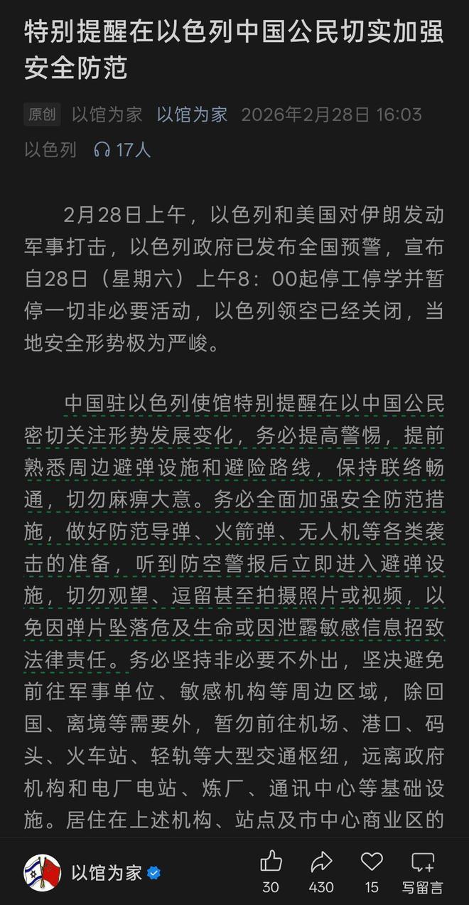 同一天,中国驻以色列大使馆发布紧急提醒称,当天上午以色列和美国对伊朗发起了军事打击行动。以色列政府已发出全国性警报,并宣布自28日早上8点开始暂停所有非必要的活动,民用航班停飞,国家领空关闭,安全局势十分严峻。