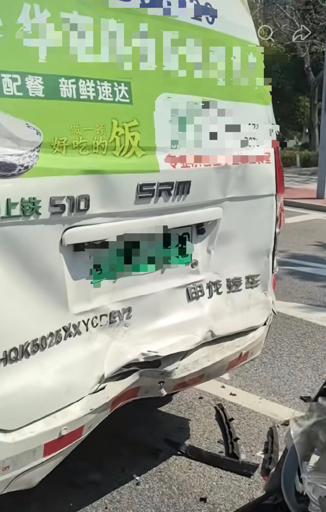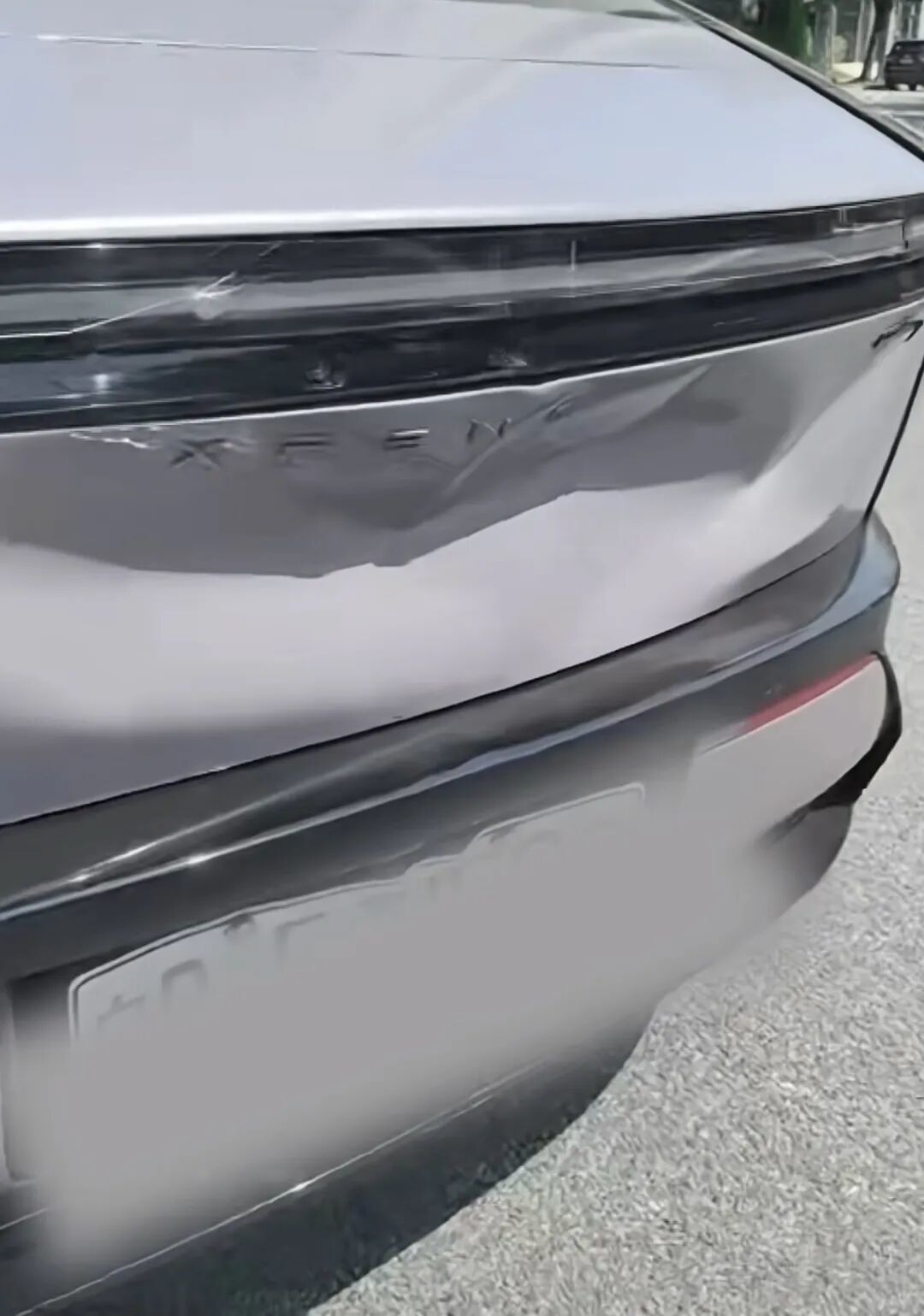 从车祸现场视频截图来看,车主驾驶的小鹏汽车遭到撞击后,车尾严重凹陷。