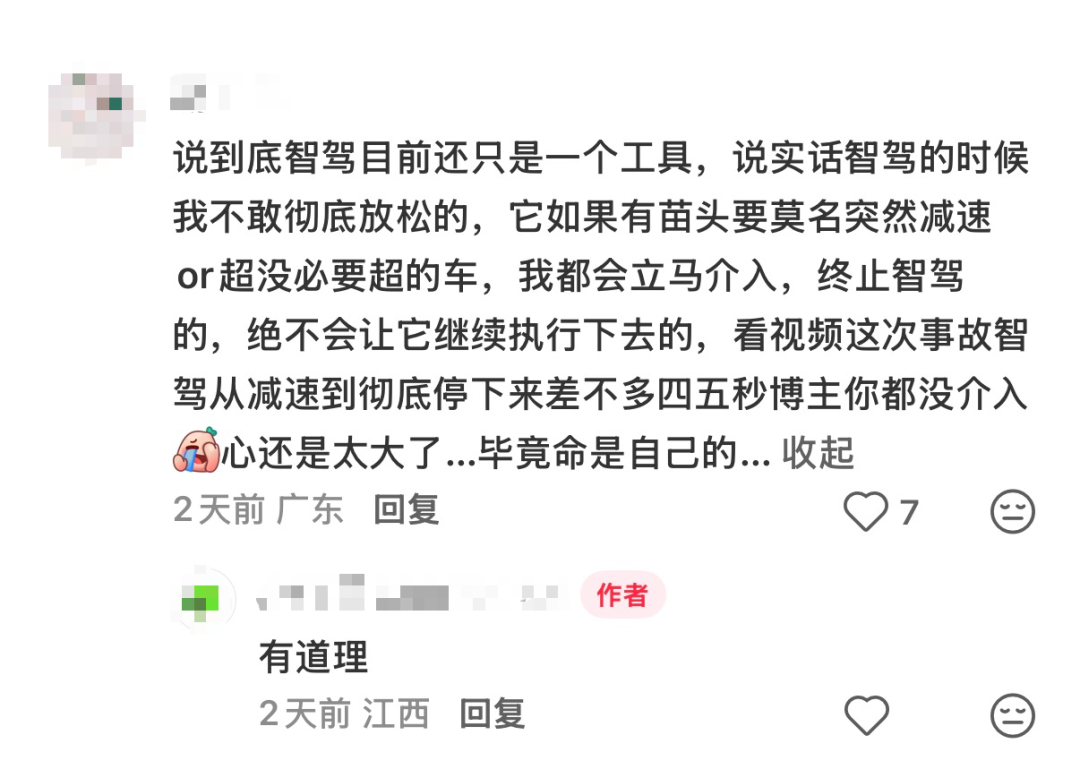 还有网友认为,目前,智驾只是工具,必要时还是需要驾驶员介入,无论如何,都要以安全为重。