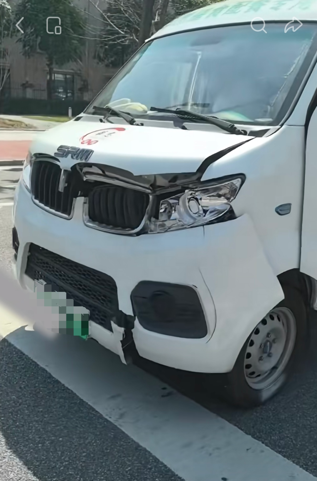 而位于中间“腹背受敌”的白色货车,前脸格栅和引擎盖区域明显变形、翘起,前保险杠右侧破损下垂。车尾亦产生严重变形、凹陷。