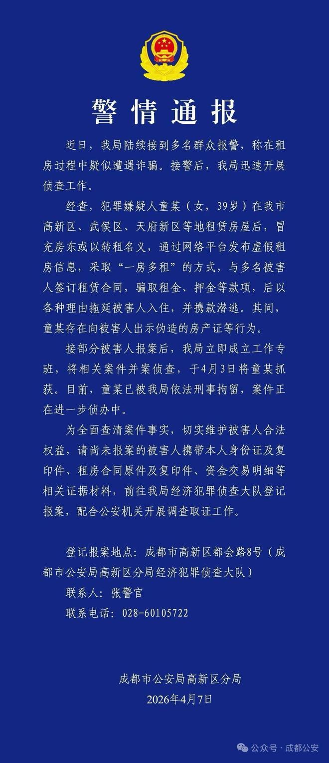 4月7日,成都市公安局高新公安分局发布警情通报称,近日,警方陆续接到多名群众报警,称在租房过程中疑似遭遇诈骗。接警后,警方迅速开展侦查工作。