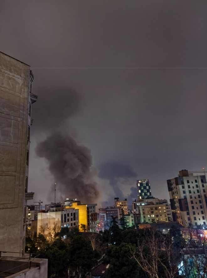 3月13日晚,伊朗首都德黑兰遭空袭后的浓烟 图/新华社