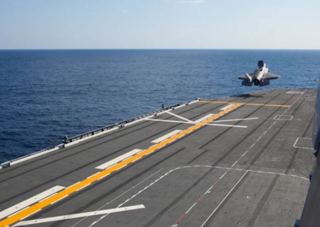 2021年10月3日,一架美国F-35B战斗机在“出云”号进行短距起飞,该舰艇的舰艏为梯形