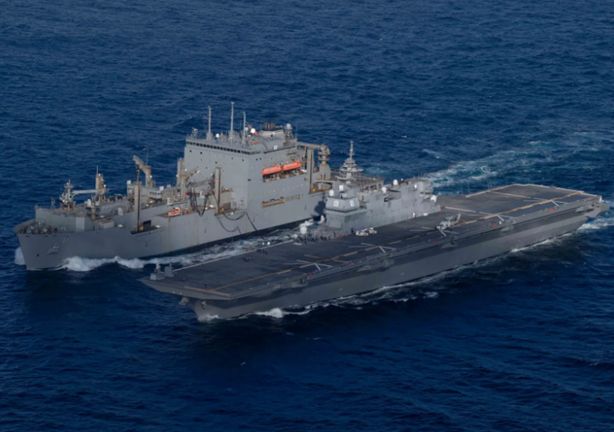 2024年11月18日,“加贺”号(右)在太平洋上进行海上补给活动,其舰艏已由梯形变为矩形 图:中国新闻网援引自美媒