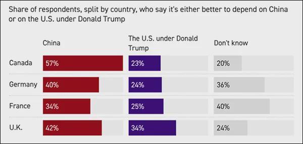 这种态度的变化主要由特朗普引发。加拿大和德国多数受访者表示,他们与中国的关系更加密切,是因为认为美国不再可靠,法国和英国也有38%和42%的受访者持相同观点。