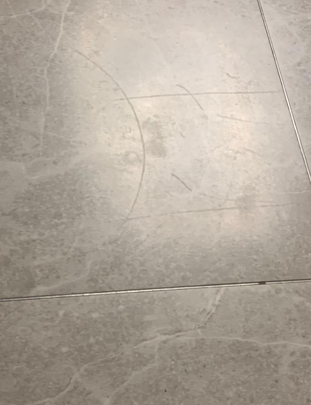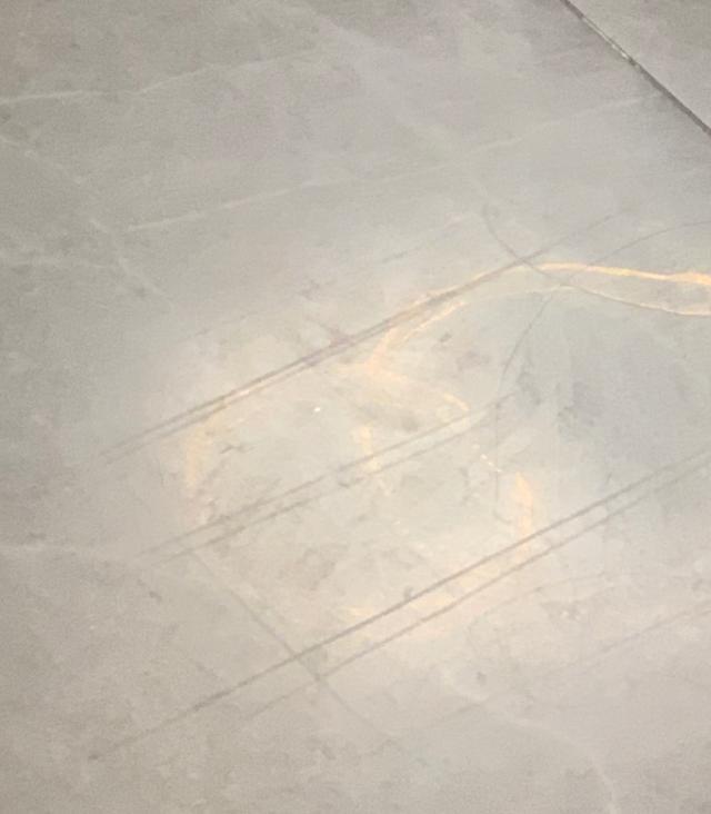 高先生的房子建筑面积为128平方米,是三室两厅两卫的格局。餐客厅大约有50平方米,并铺设着精装交付的大块地砖。从高先生提供的照片和视频中可以看到,他家中的餐客厅地砖上布满了各种形状不规则的划痕,包括直线、曲线甚至网格状痕迹,这些痕迹与扫地机器人的行走路线高度吻合,几乎覆盖了整个餐客厅的地砖表面。