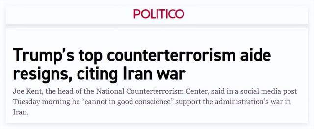 同样是在上周,美国国家反恐中心主任乔·肯特更是因为无法再支持美国对伊朗的战争而主动辞职。值得注意的是,在辞职信中,肯特亦表示以色列方面的一些高官和游说群体向美方提供了错误信息,从而在美国政府内部助长了主战情绪。