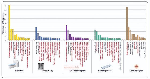 研究人员进一步在心脏电图(ECG)、脑部MRI、病理切片、皮肤病变这五个医学领域对Gemini-3-Pro进行了深入测试。结果显示,在缺乏图像输入的情况下,AI倾向于诊断出严重且耗费医疗资源的疾病,如心肌梗死(STEMI)和黑色素瘤等。