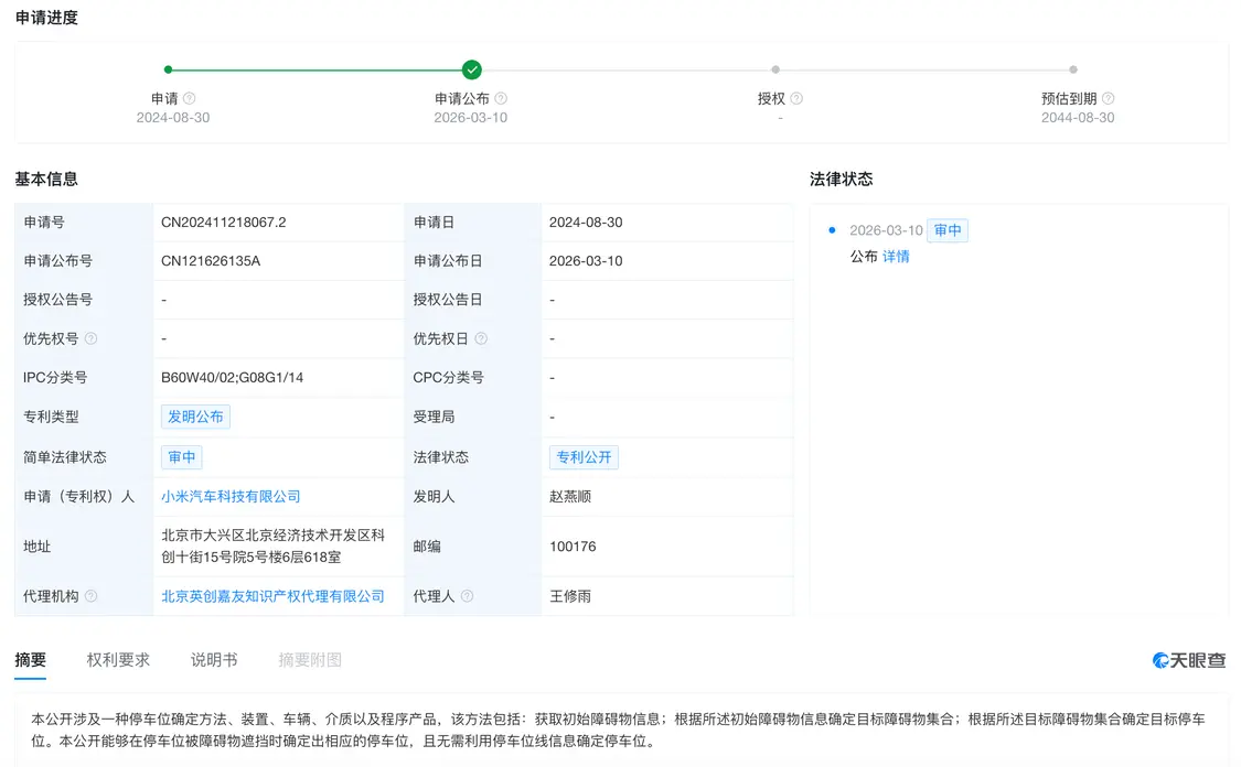 最近,小米汽车科技有限公司的一项名为“停车位确认方法、装置、车辆及相关程序产品”的专利已公开。据天眼查的信息显示,这项技术涉及获取初步障碍物数据,并基于这些信息识别关键的障碍物体集合,进而确定目标停车位置。该专利能够在某些情况下自动检测出被障碍物遮挡的停车位,而无需依赖于传统的车位标记线来判断。