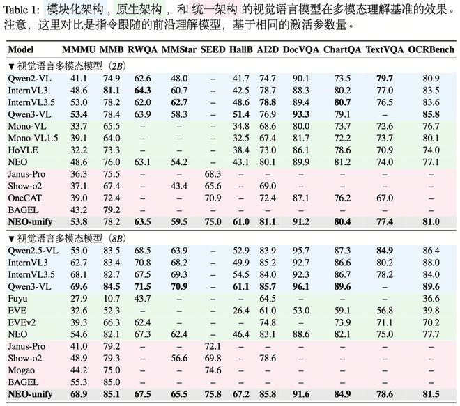 在实验中,使用NEO-unify架构训练出的模型在多个基准测试中的表现优异,接近Qwen3-VL的表现水平,且在同一尺寸下领先于其他视觉语言模型。
