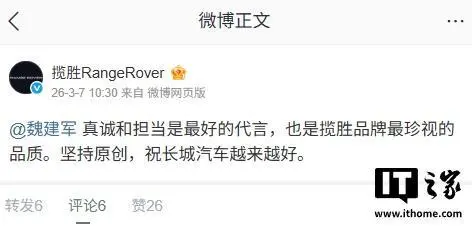 今日,揽胜官方微博账号发布声明回应此事:真诚与担当是企业最有力的形象代言,也是揽胜品牌一直珍视的核心价值观。他们表达了对原创精神的支持,并祝愿长城汽车未来发展更加美好。