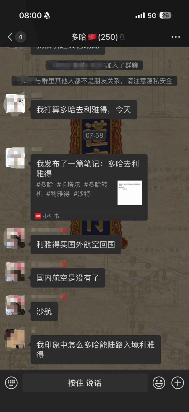 多哈机场内中国旅客组建微信群互帮互助(图片未显示)。