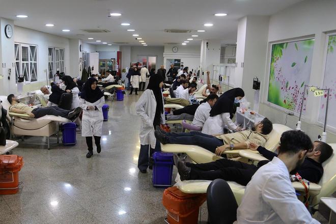 2026年3月7日,在德黑兰的一处献血中心可以看到许多市民正在为受伤人员提供援助