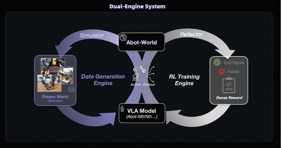ABot-Dream 是ABot-PhysWorld 的高级演化形态,旨在成为一个通用决策引擎,在物理世界中自主生成和执行复杂的策略,并能够将这些策略无缝迁移到真实的机器人平台。这一系统通过闭环反馈机制实现持续优化与进化,构建起从预训练到真实部署再到数据回流的良性循环。